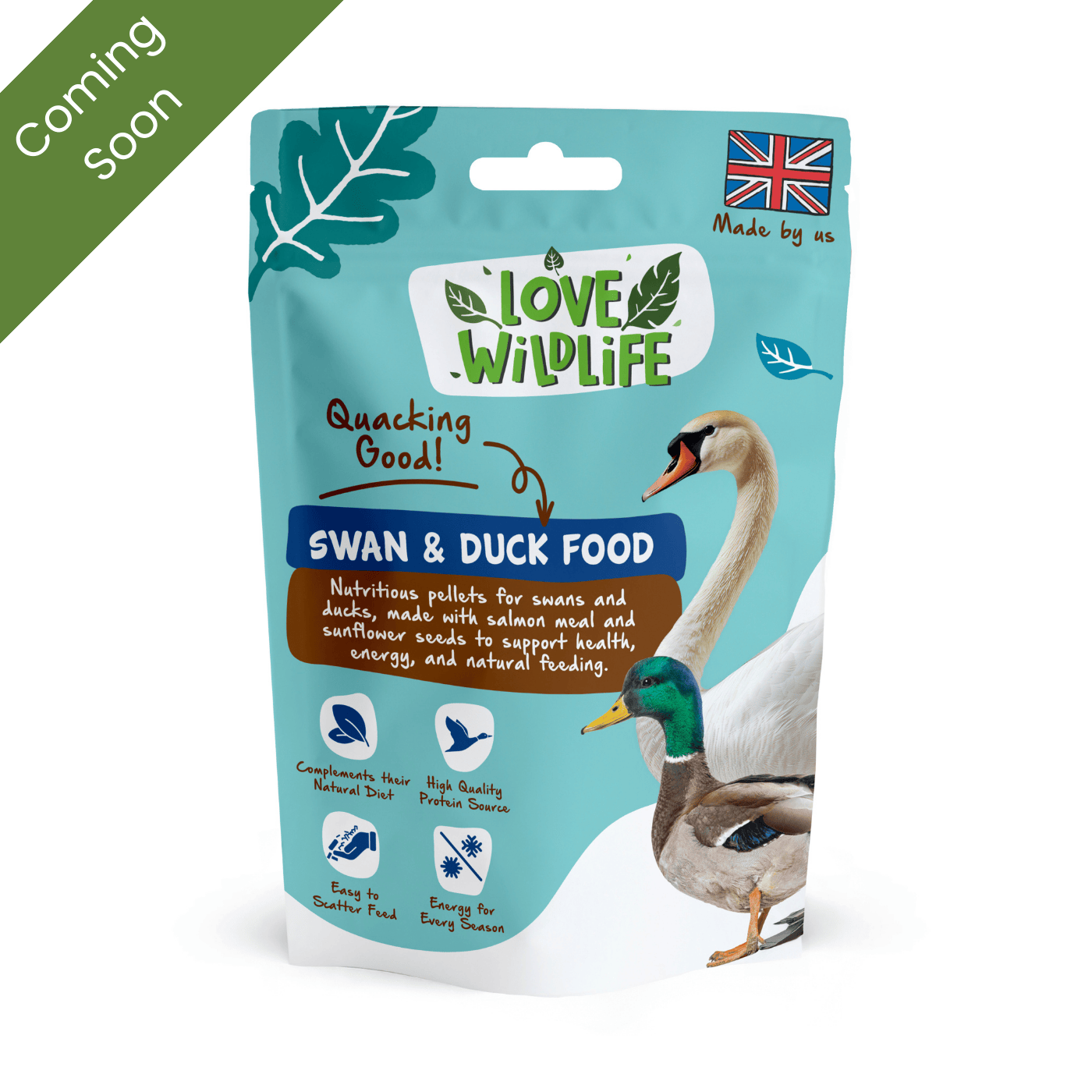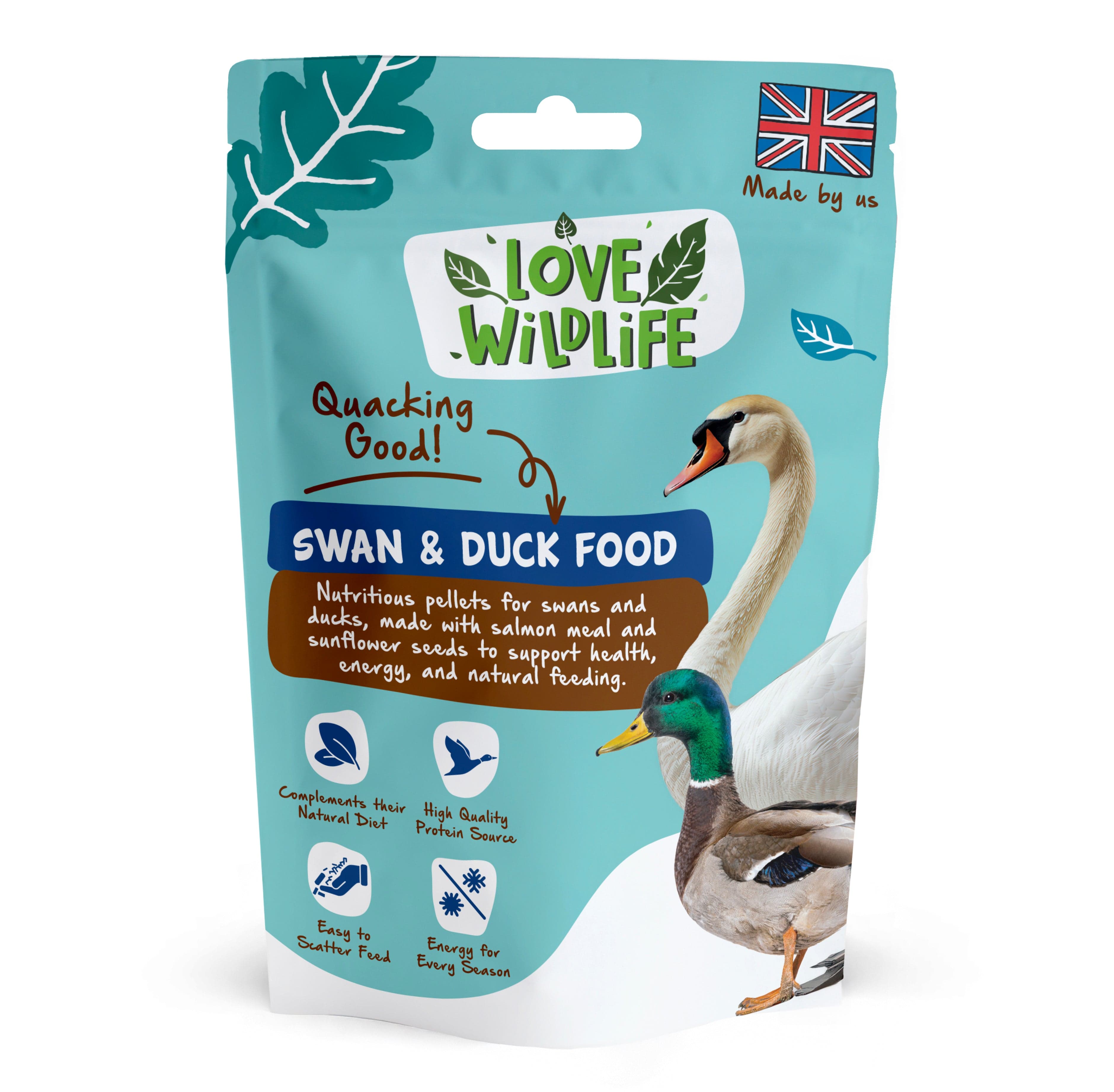 Move over sad looking, nutrient deficient bread, and say hello to our tasty, nutritious Love Wildlife Swan & Duck Food. Our Swan & Duck Food contains the perfect, nutritious pellets to feed wild waterfowl of all shapes, species, and sizes. Packed full of delicious, healthy ingredients, such as salmon meal and sunflower seeds, this food is brimming with vitamins and minerals that are essential for swans and ducks to thrive. Easy to scatter feed to encourage your local water birds to peck. This food is especially great to feed during the winter months when food is more scarce, as it is naturally high in protein and good fats, providing birds with the energy that they need.